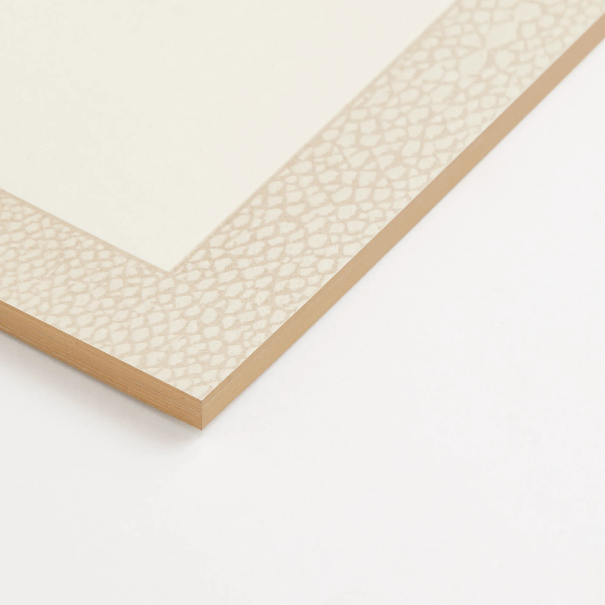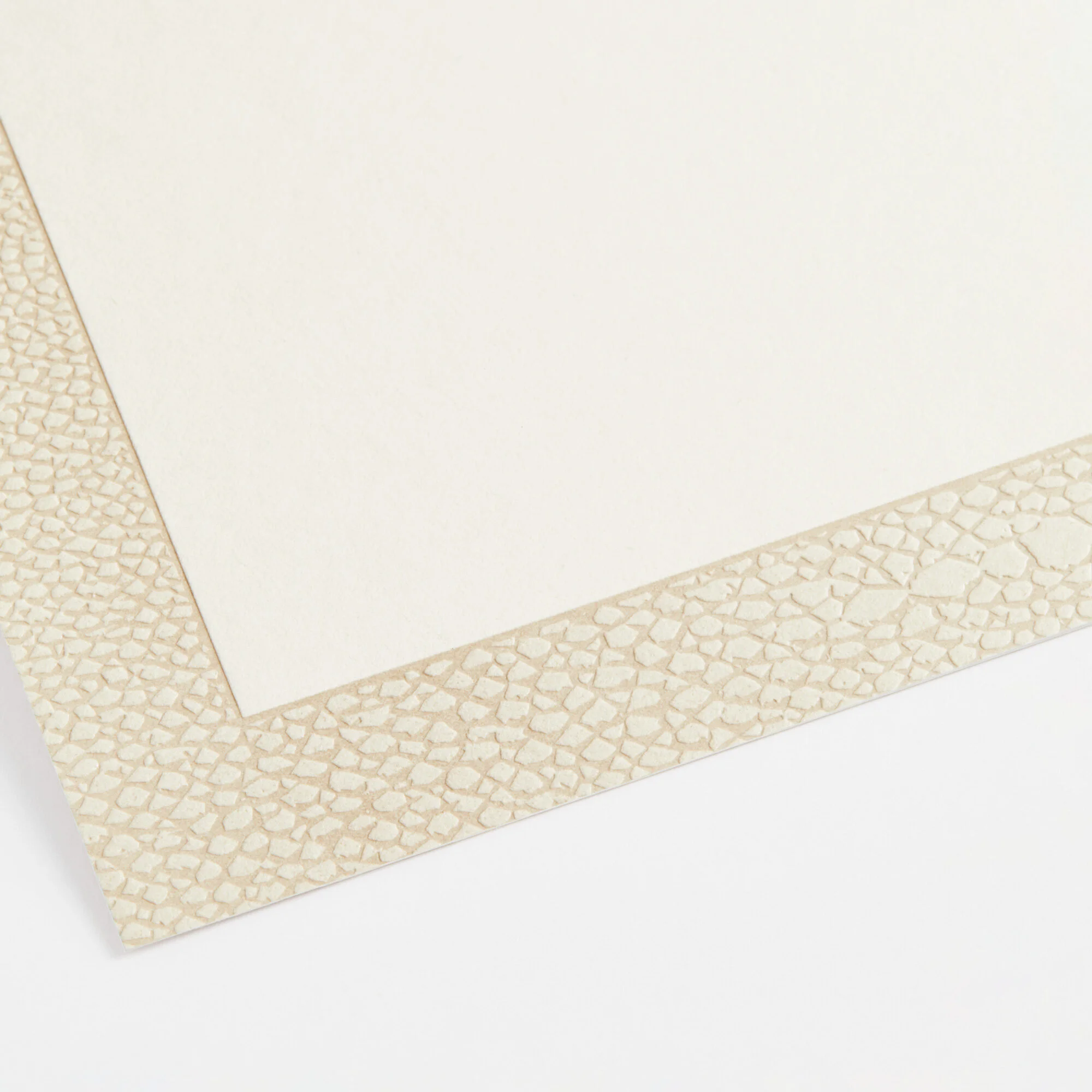 Set of nine personalised note cards with a soft taupe shagreen print pressed pattern. Paired with bronze-foil-trimmed envelopes and beautifully packaged in an embossed old rose box.